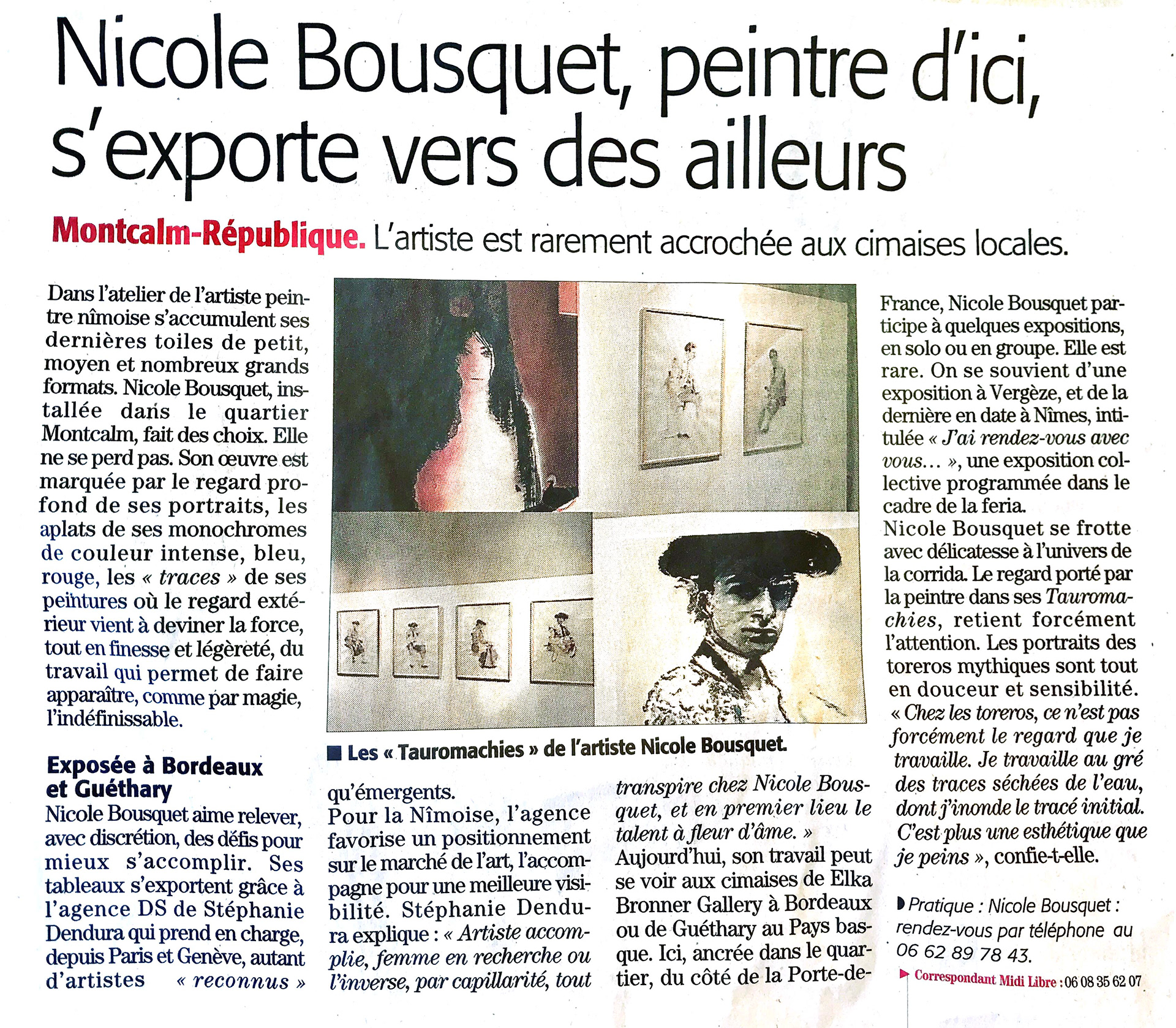 Sur cette affiche, ce portrait de la torera Conchita Cintrón, à la brou de noix et à l'encre, c'est la femme qui est à l'honneur bien sûr mais pas seulement. Une torera, une déesse blonde dans un monde masculin qui regarde dans la bonne direction, celle de l'avenir encore radieux de cette tradition qui malgré les tempêtes et stars du petit écran, a de beaux jours devant elle. Cette oeuvre nous remplit d'émotion certes. Elle nous emporte surtout vers un horizon de liberté. Comme celle dont a bénéficié l'artiste nîmoise pour apporter un peu de douceur dans cette période si violente. En mettant à l'honneur Conchita Cintrón, Nicole Bousquet a fait aussi le choix de marquer comme une trace indélébile une époque. Une certaine époque où la rejoneadora s'imposait au centre des arènes. Jusqu'à transmettre le flambeau à Marie Sara un certain 21 septembre 1991 à Nîmes, lors de son alternative. Sur la toile, la torera semble sereine, figée dans le temps. Les légendes ne meurent jamais. Une toile unique qui trouvera certainement des détracteurs. L'art est subjectif. Mais comment ne pas saluer l'audace de la Ville et de son adjointe à la Culture d'avoir imaginé une proposition si touchante ? Par les dix petits doigts d'une Nîmoise si talentueuse. Peu de femmes jusque là ont eu la chance de pouvoir s'exprimer sur une affiche de feria de Nîmes. Elle doit être à peine la troisième... Elle est certaine désormais, Nicole Bousquet, d'ouvrir la voie à tous les possibles...